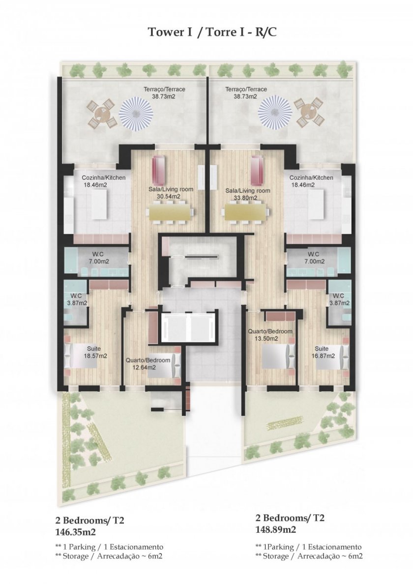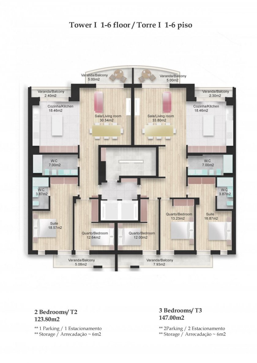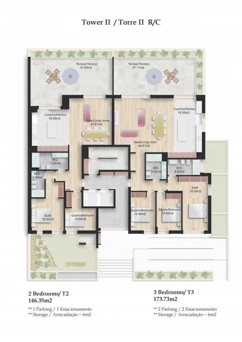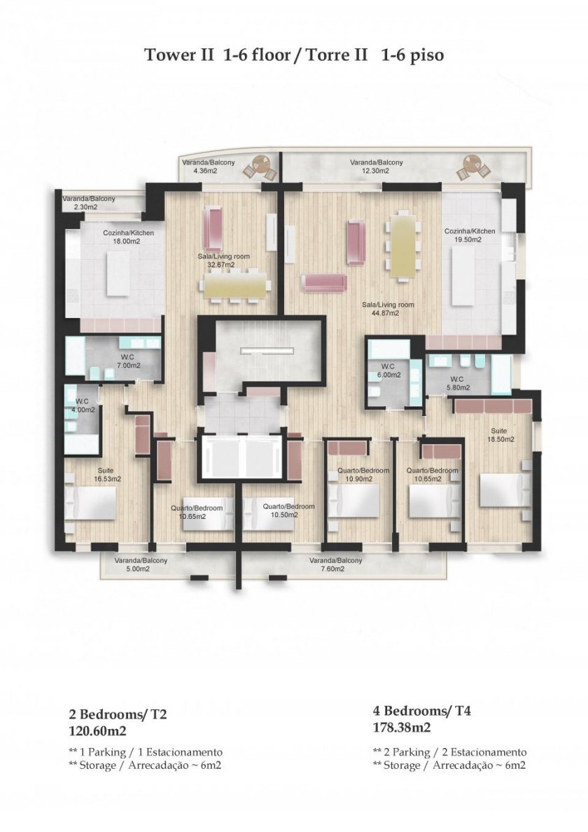 The luxurious 2 to 4 bedroom apartments ranging from 121 m2 to the largest 178 m2. All apartments comprise great living and dining areas with access to a stunning balcony, a fully equipped open-kitchen and the excellent suite, as well as the parking spaces and storage. With functional and well designed interiors, the apartments stand out with top finishing and quality of construction that contributes to the creation of an atmosphere that is an example of comfort.